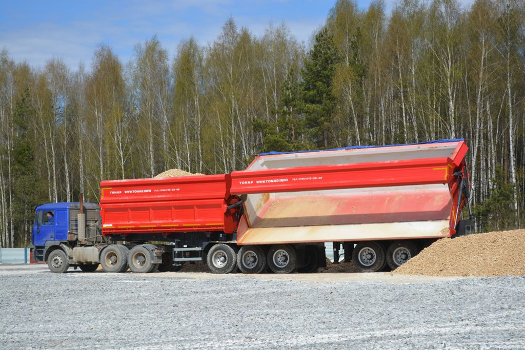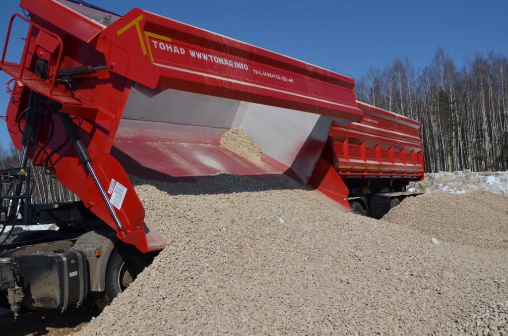 Грузоподъемность до 95700 килограмм, и объем кузова 63,8 кубических метра, усиленную рессорную подвеску, двухконтурное гидрооборудование и шесть осей с двускатной ошиновкой.