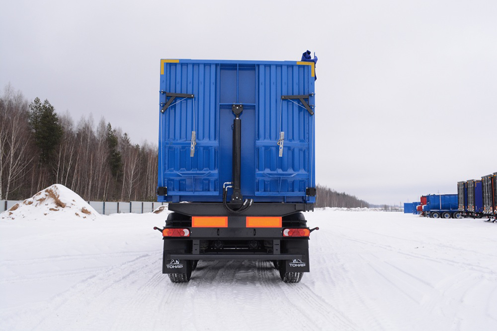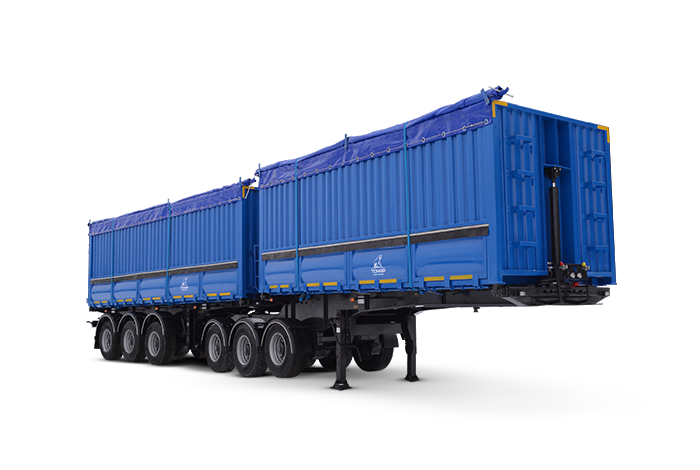 Сочлененный автопоезд с самосвальной разгрузкой на правую сторону, с разгрузочными лючками, предназначен для перевозки зерновых культур с объемом кузова 72 куб.м.
