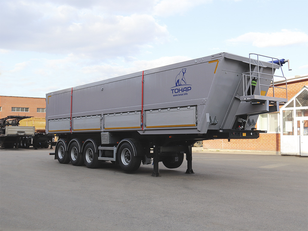 Кузов прямоугольной формы выполнен из качественного алюминия и оснащен защитным тентом с механическим приводом. Задний борт Тонар-9599 комбинированный и имеет дополнительные разгрузочные лючки.